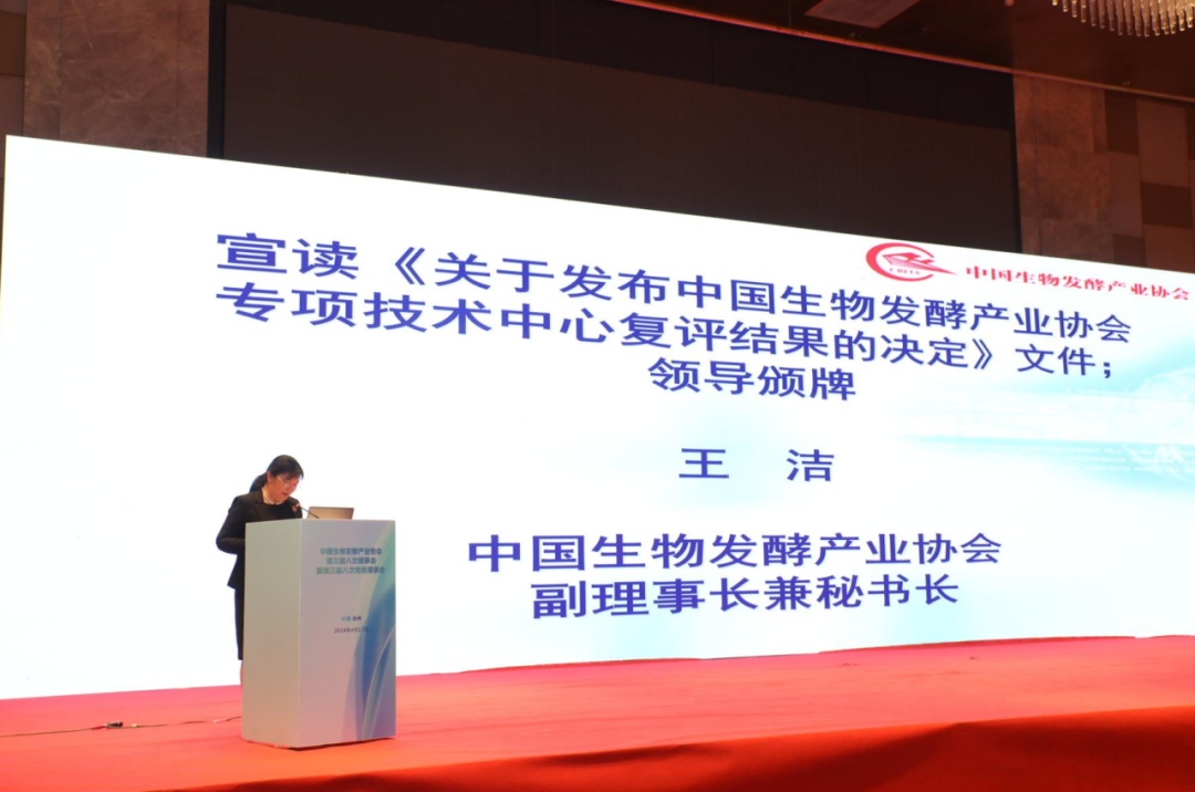 王洁秘书长就中国生物发酵产业《2023年经济运行情况报告》等方面做了分享与交流,并宣读颁奖文件。